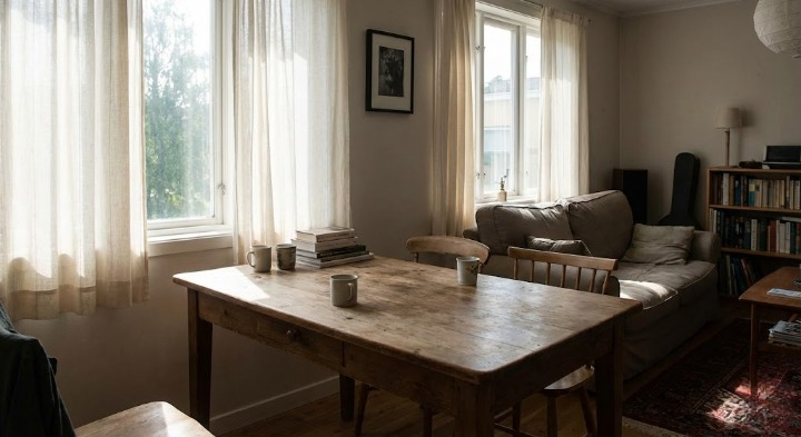 Khi sử dụng bàn ăn, bạn cũng nên dùng thêm miếng lót khi đặt nồi lẩu hoặc bát canh nóng để tránh làm hư hại lớp sơn bảo vệ trên bề mặt gỗ. Về độ ẩm, nếu phòng quá ẩm thấp, gỗ rất dễ bị mốc; ngược lại, nếu không gian chạy điều hòa liên tục và quá khô, gỗ có thể bị nứt dăm. Giữ phòng luôn thông thoáng, độ ẩm ở mức vừa phải sẽ giúp nội thất gỗ tự nhiên bền hơn theo thời gian. Trong phòng điều hòa, bạn có thể đặt thêm một chậu nước nhỏ hoặc bình hoa tươi để cân bằng độ ẩm.