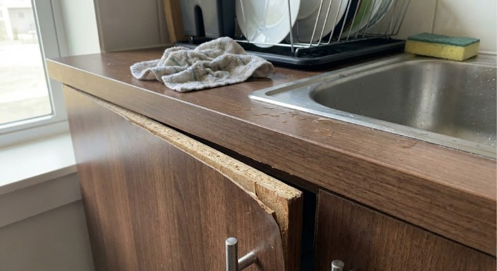 Cốt gỗ được ép từ bột gỗ nên rất nhạy cảm với nước. Khi nước thấm vào trong thời gian dài, cốt gỗ sẽ nở ra, gây phồng rộp bề mặt và hư hỏng gần như không thể phục hồi. Trong quá trình sử dụng, đặc biệt ở khu vực bếp và chậu rửa, bạn nên lau khô ngay khi có nước đổ ra bề mặt. Đồng thời, cần kiểm tra định kỳ các mép dán cạnh – đây là “lớp phòng thủ” quan trọng giúp ngăn nước xâm nhập vào bên trong. Nếu mép dán bị bong, nên xử lý sớm để tránh hư hỏng lan rộng.