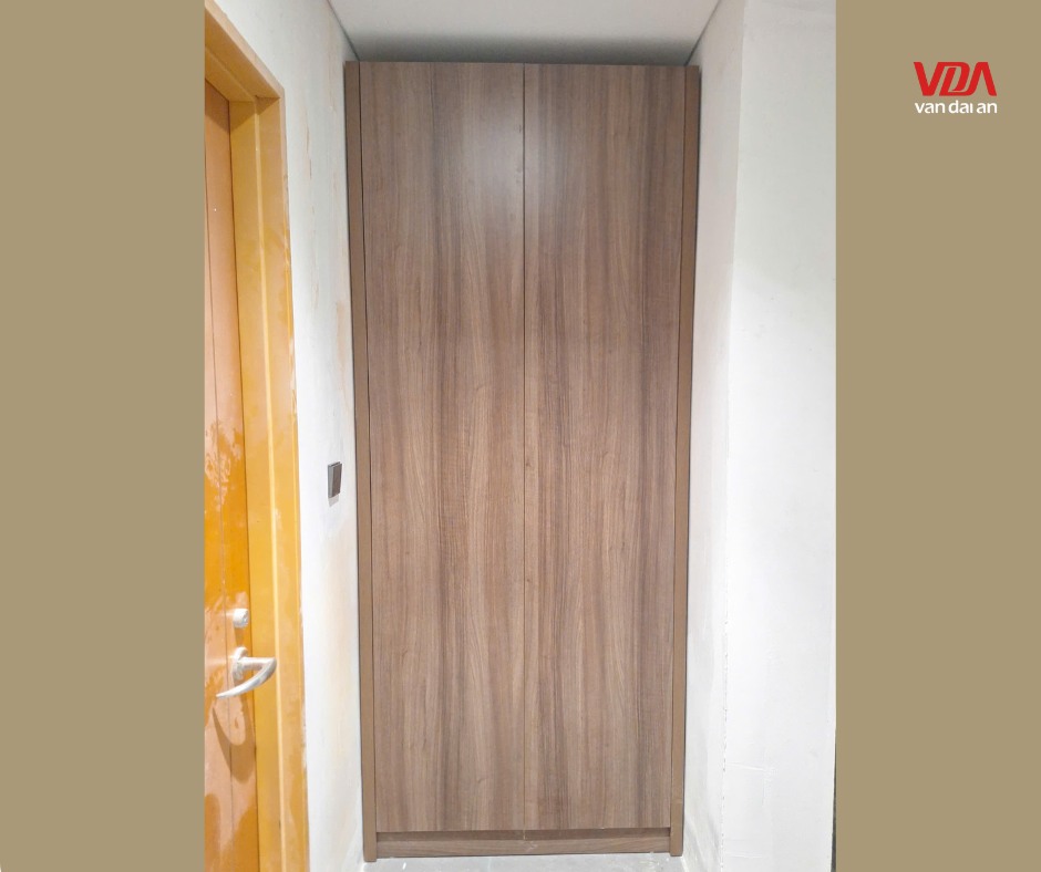 Hình ảnh thực tế cho thấy hệ tủ cao kịch trần được lắp đặt vừa vặn, che đi các khuyết điểm của phần tường thô. Các cánh tủ lớn được thiết kế với vân gỗ chạy ngang liền mạch, tạo hiệu ứng thị giác giúp không gian lối vào trông rộng hơn. Việc căn chỉnh bản lề chính xác giúp khe hở giữa các cánh đều đặn, đảm bảo tủ đóng mở nhẹ nhàng mà không bị cạ vào trần hay sàn nhà.