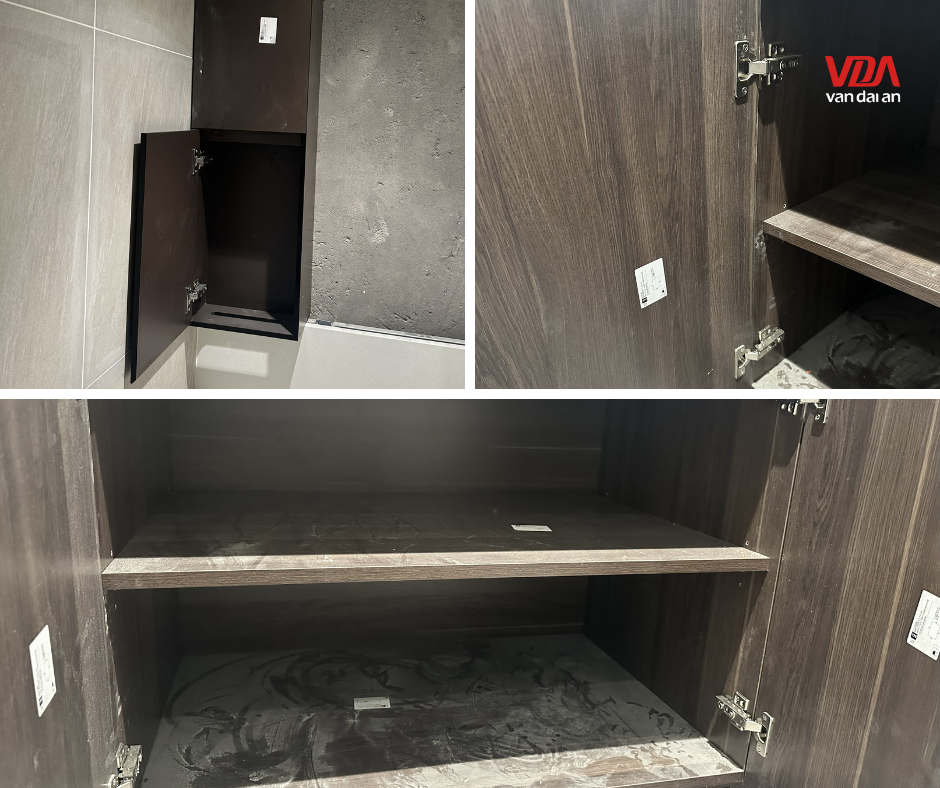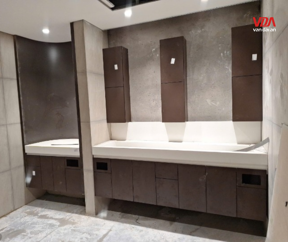 Thi công nội thất gỗ văn phòng trong môi trường ẩm ướt như nhà vệ sinh luôn đòi hỏi tiêu chuẩn khắt khe hơn các khu vực khác. Tại Vạn Đại An, chúng tôi giải quyết bài toán độ bền bằng việc sử dụng cốt ván kháng ẩm chuyên dụng cho toàn bộ hệ tủ Lavabo.