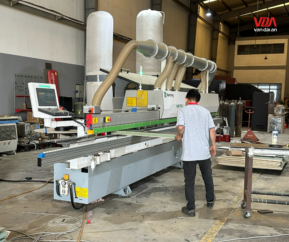 Tại xưởng Vạn Đại An, bề mặt cánh tủ và các đợt kệ được xử lý bằng công nghệ dán cạnh tự động. Đường chỉ nẹp tiệp màu hoàn toàn với bề mặt, giúp hệ tủ trông như một khối gỗ đặc liền mạch. Đây là tiêu chuẩn bắt buộc trong thi công đồ gỗ văn phòng cao cấp để đảm bảo sản phẩm sắc sảo dưới mọi góc nhìn.